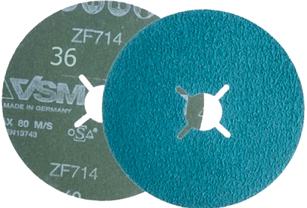 Krązek fibrowy firmy VSM ZF714 z ziarnem cyrkonowym to wysokiej jakości, wytrzymały, bardzo giętki, wulkanizowany krążek fibrowy produkowany są na elastycznym podłożu. Dyski fibrowe VSM ZF714 z ziarnem ceramicznym charakteryzuje duża wydajność oraz trwałość, a także zwiększona prędkość obróbki i wysoka jakość szlifu. Ziarno cyrkonowe zastosowane w dysku fibrowym modelu VSM ZF714 przyczynia się również do bardzo dużych ilości urobku szlifowanego materiału. Dyski fibrowe VSM ZF714 w szczególności znajdują zastosowanie podczas zgrubnych prac obróbczych szlifierką kątową o max prędkości obwodowej 80 m/s. Idealny do szlifowania płaskich lub wypukłych powierzchni z dużą elastycznością. Nadaje się do wszystkich gatunków stali i stopów metali. Zastosowanie: usuwanie spoin, usuwanie zendry, usuwanie niedoskonałości powierzchni, fazowanie, krawędziowanie.